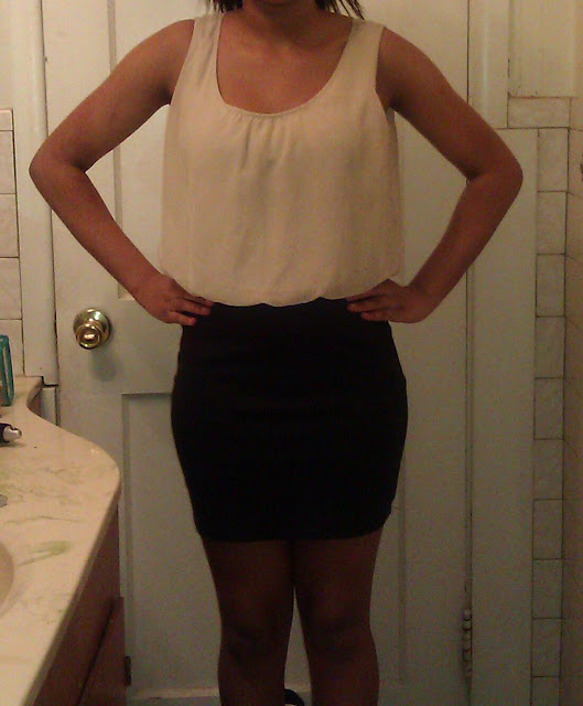 So the first dress I showed you a few weeks ago, in a haul, I think. Its a black fitted short skirt with a beige-y colored flowy top type of dress from Wet Seal and it cost about $25, and its on their website if you wanna check it out(: